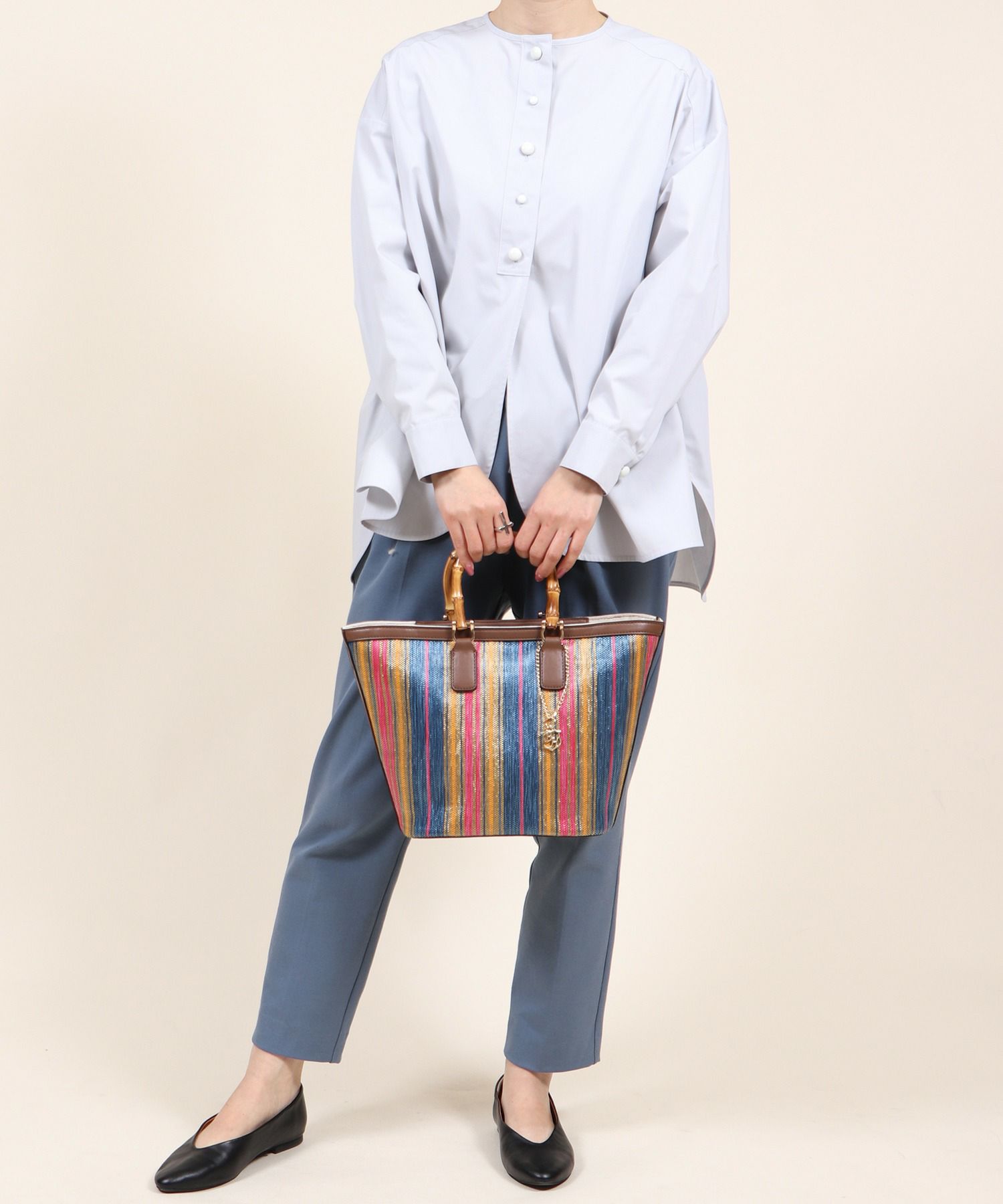 女性らしい船形のシルエットにバンブーハンドルがポイントになったトートバッグ。