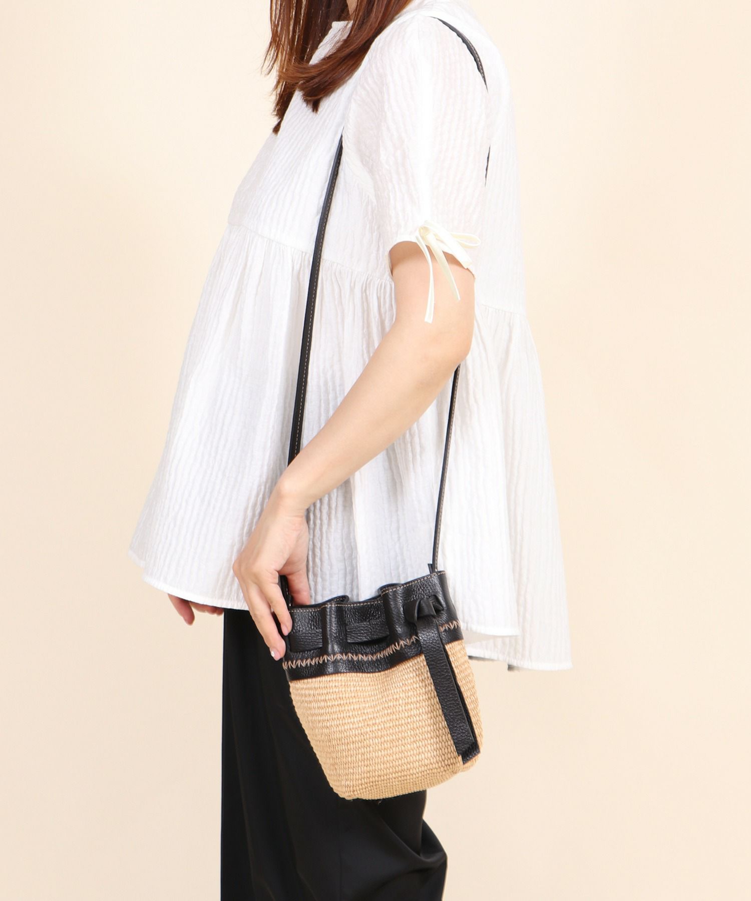 目を詰めてしっかりと編み上げたかごと、カーフスキンのコンビネーションミニショルダーバッグ。