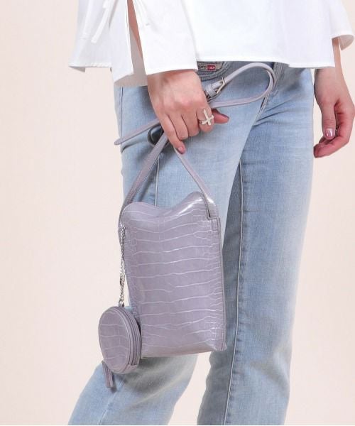ワンカラーのシンプルな色使いながら、クロコ型押しの立体的な素材感が目を惹くミニショルダーバッグ。