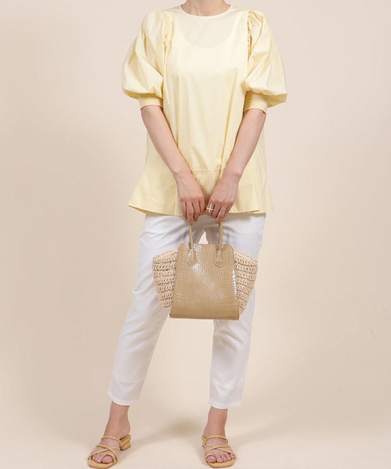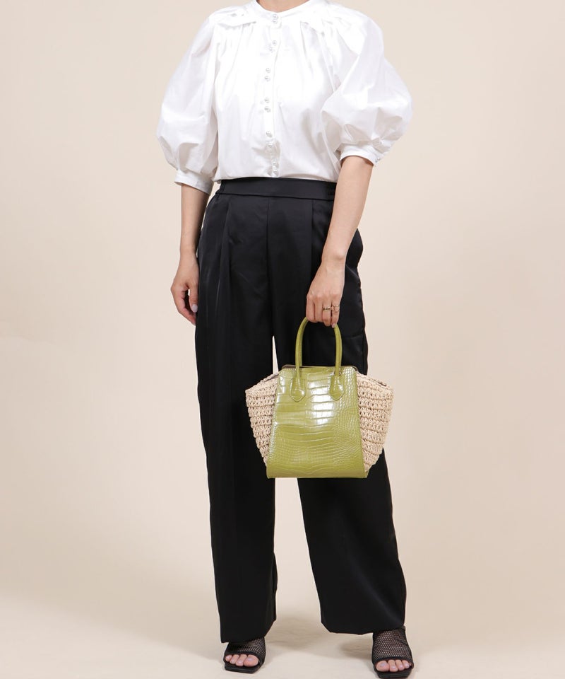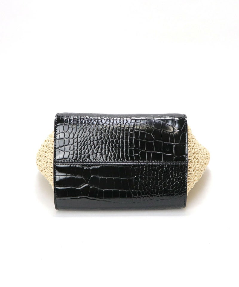 クロコ型押しのメイン部分に、サイドにはペーパー素材を使用したスタイルが印象的。