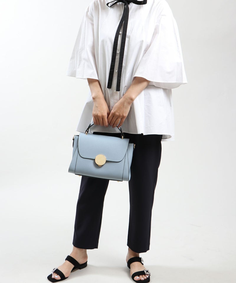 フロントのマーブル柄サークル金具が目を惹く、本革製のハンドバッグ。