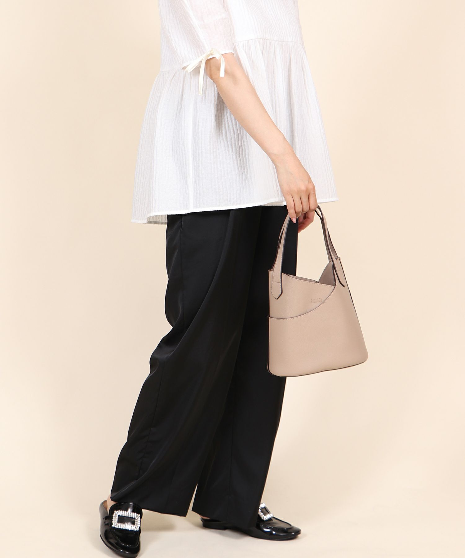 付属のショルダーを繋げば肩掛け・斜め掛けもできるショルダーバッグ仕様になり、雰囲気を変えて持てるのでコーデの幅も広がります◎