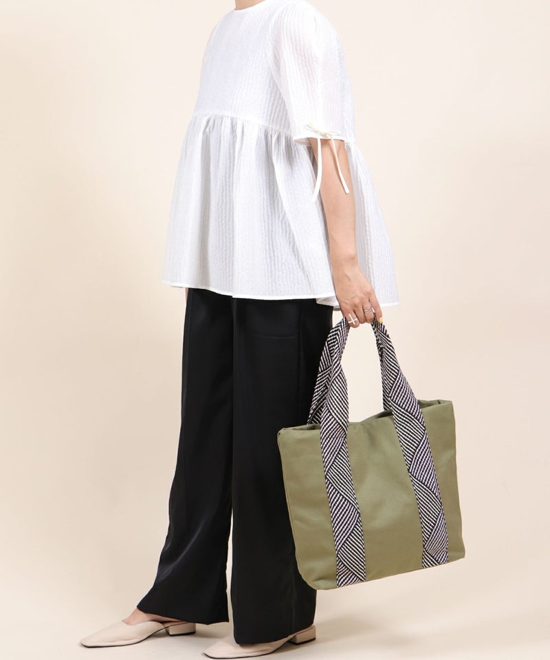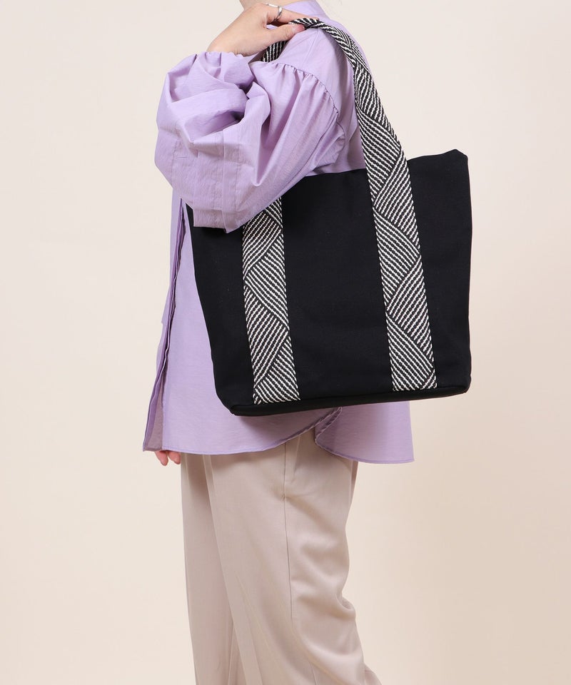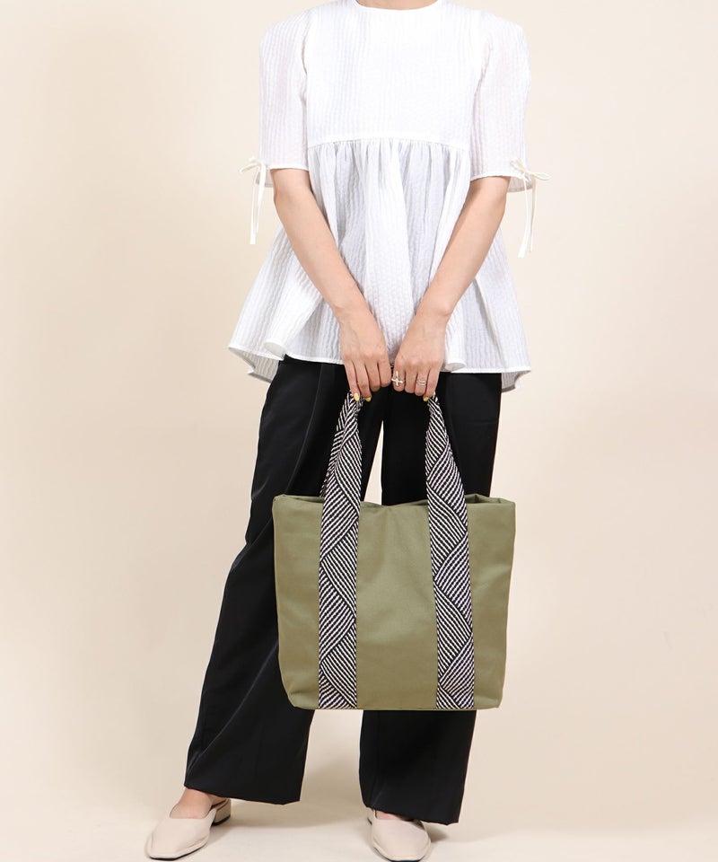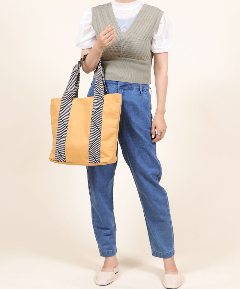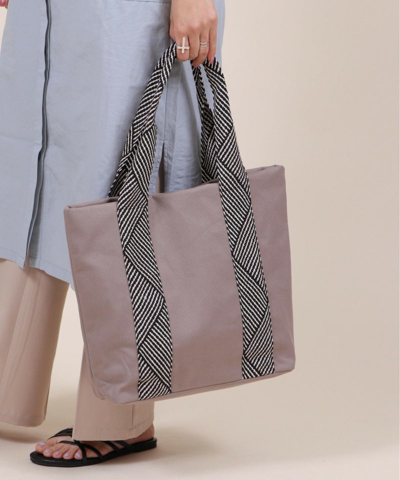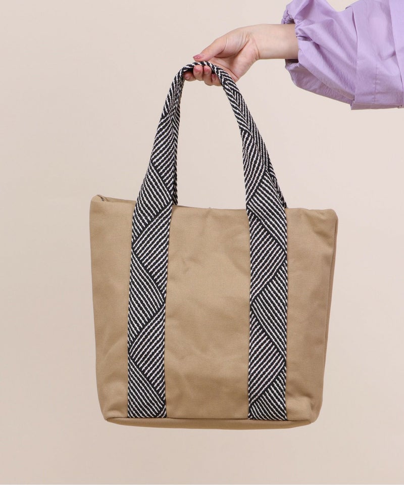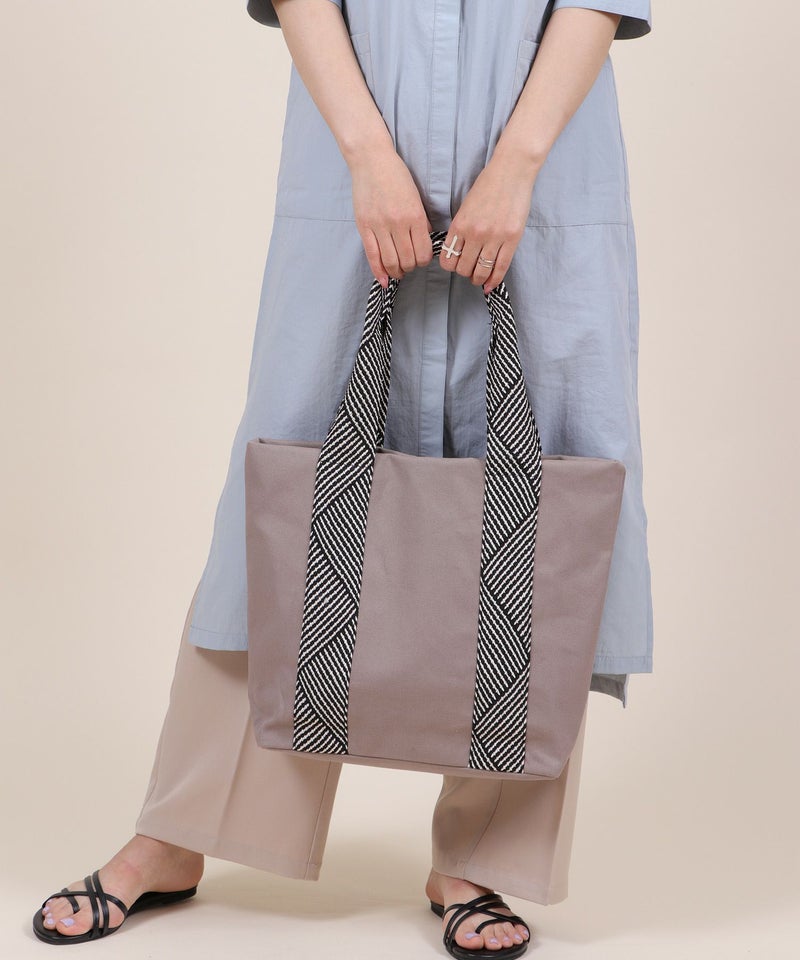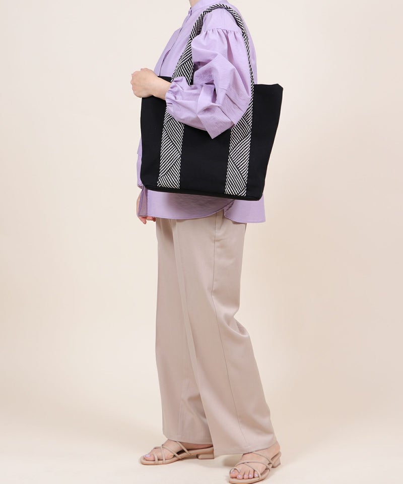 ベーシックなシルエットにラメ入りのテープハンドルを組み合わせて、華やかな印象に仕上げたトートバッグ。