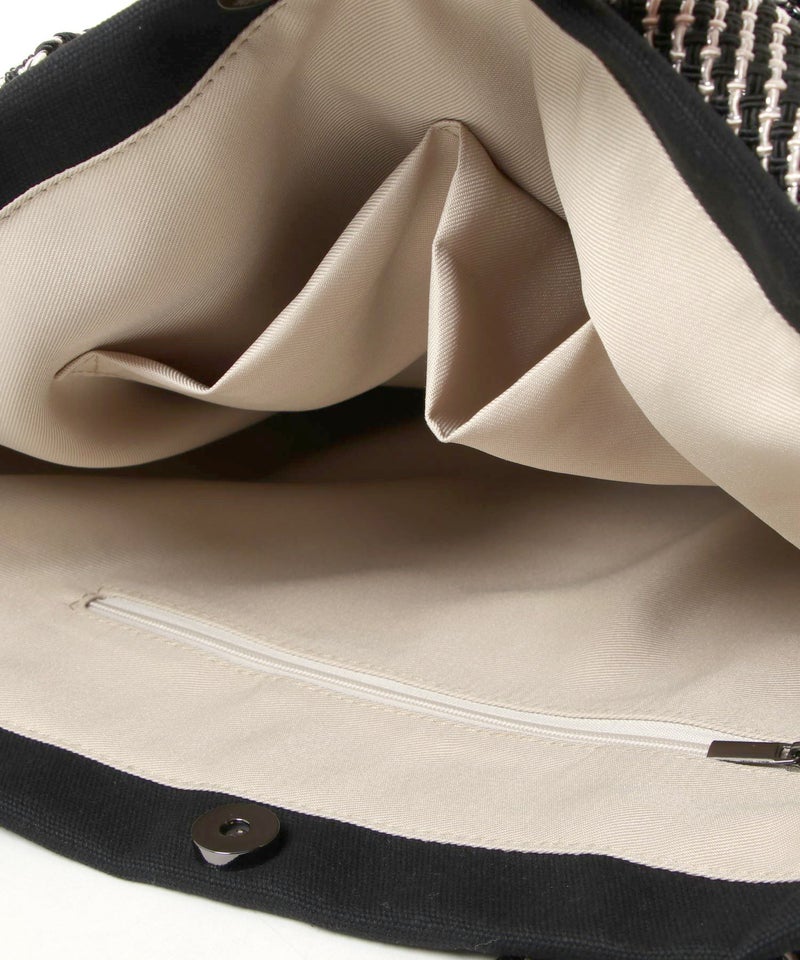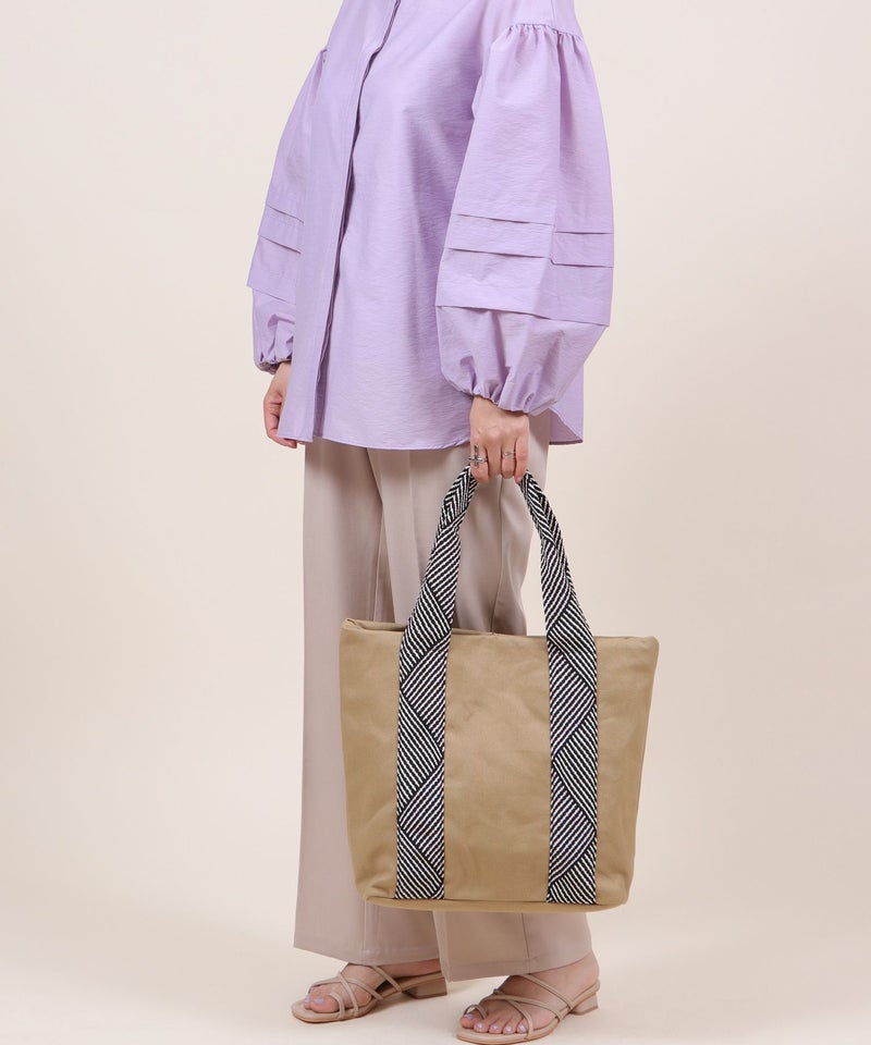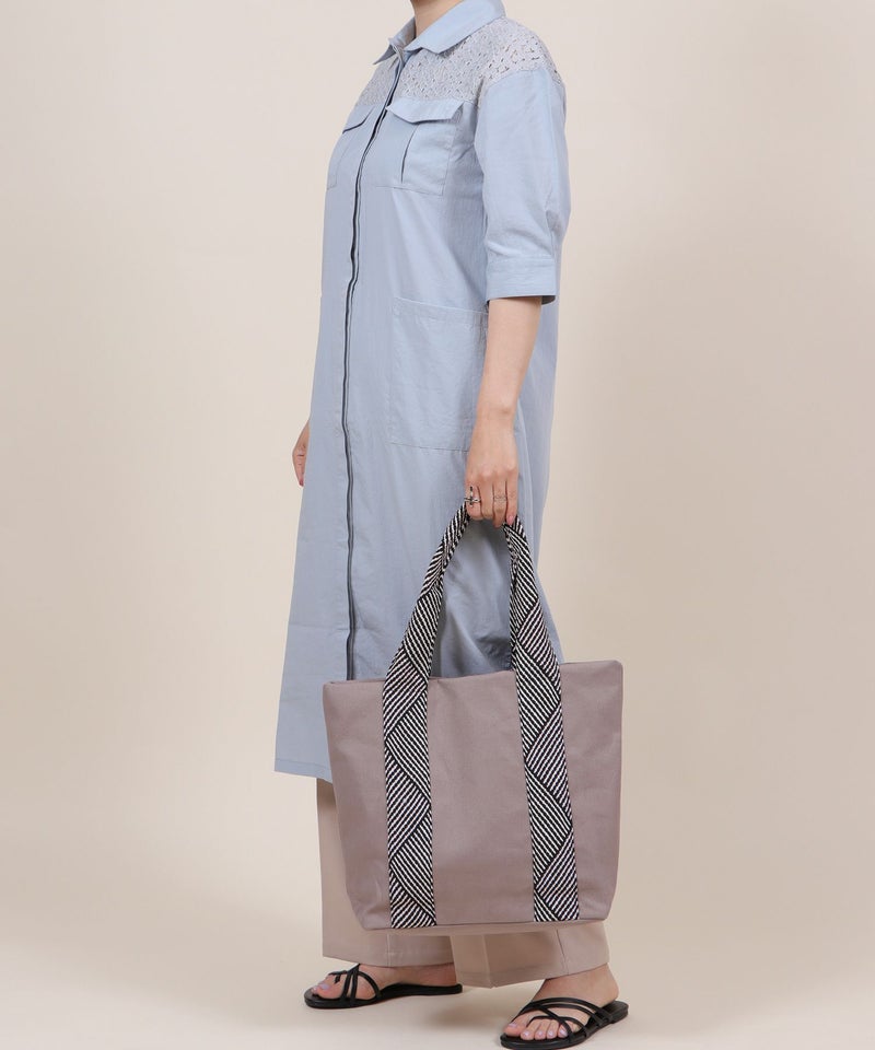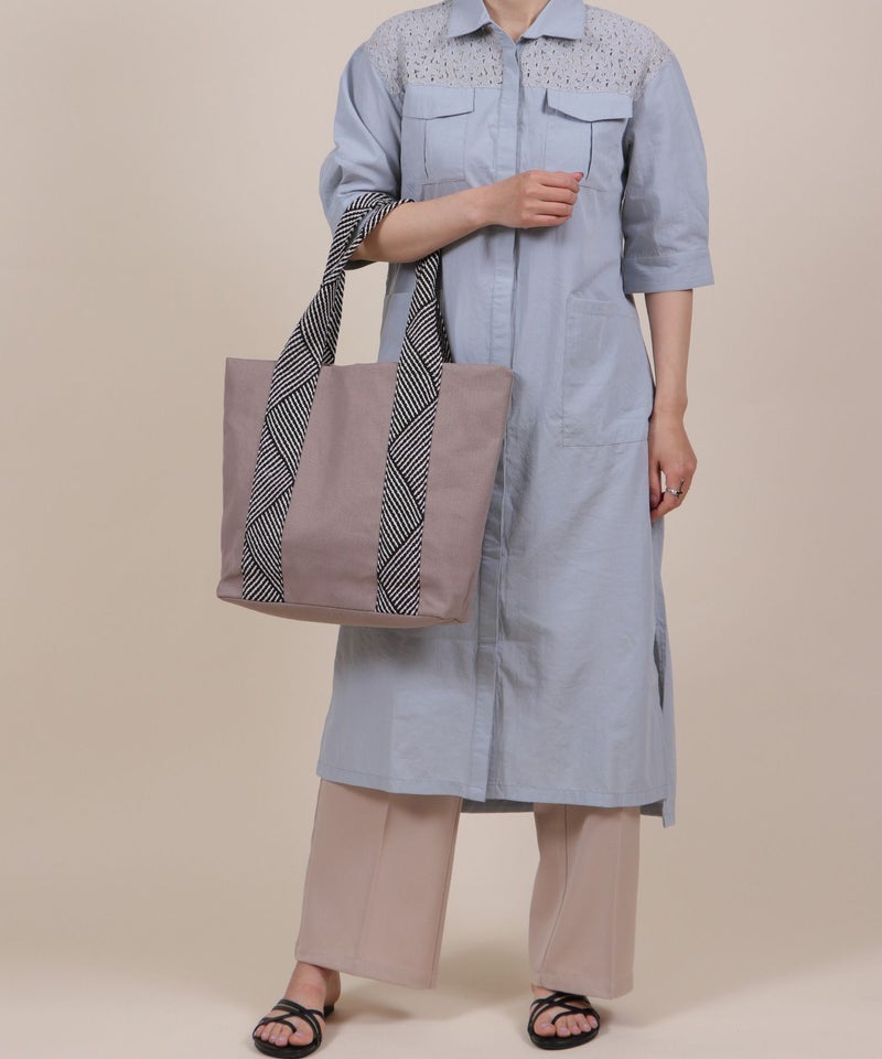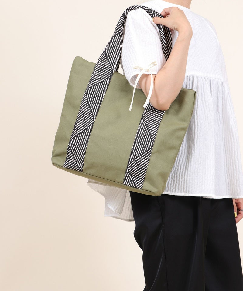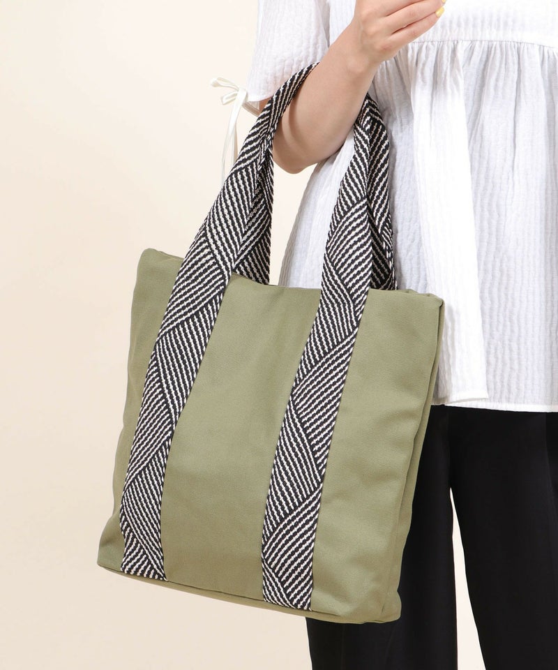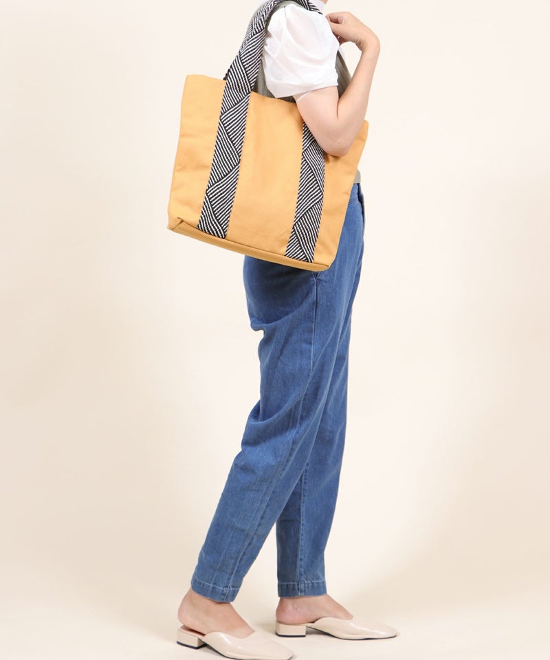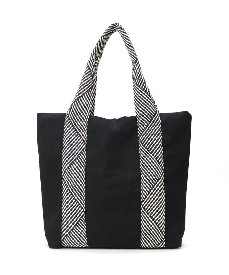ベーシックなシルエットにラメ入りのテープハンドルを組み合わせて、華やかな印象に仕上げたトートバッグ。