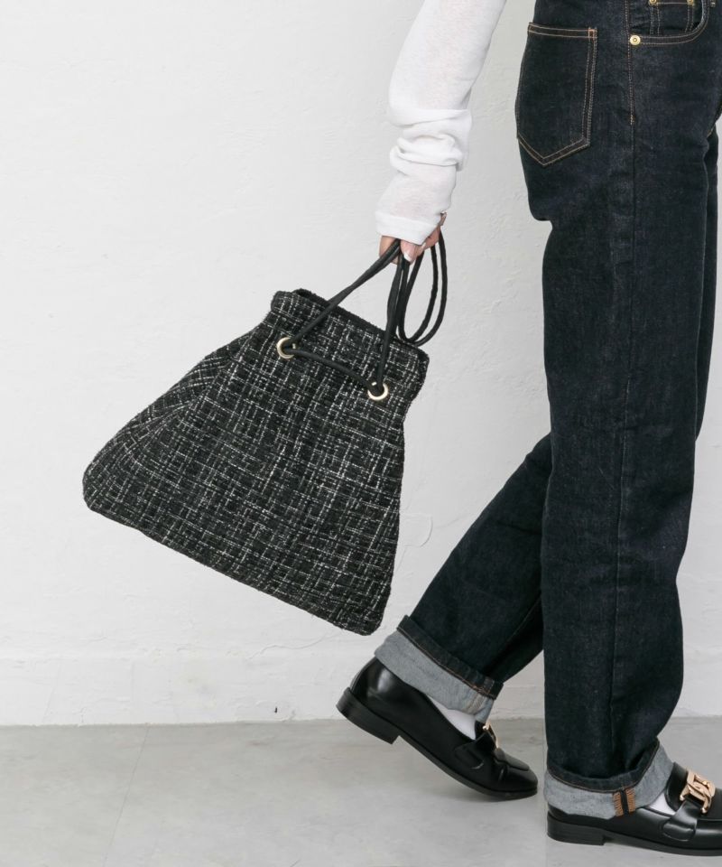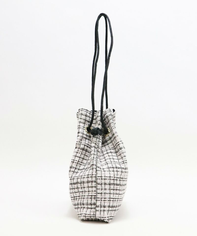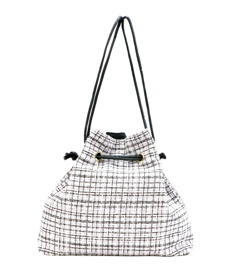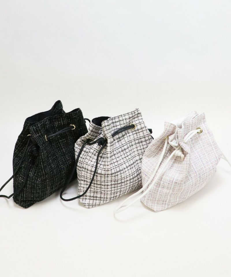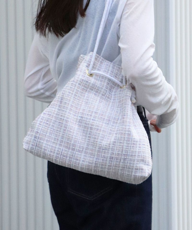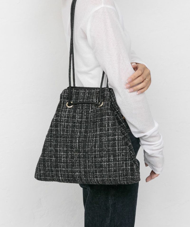 様々なカラーの糸を織り込んで作られたツイード生地で仕立てた巾着ショルダーバッグ。