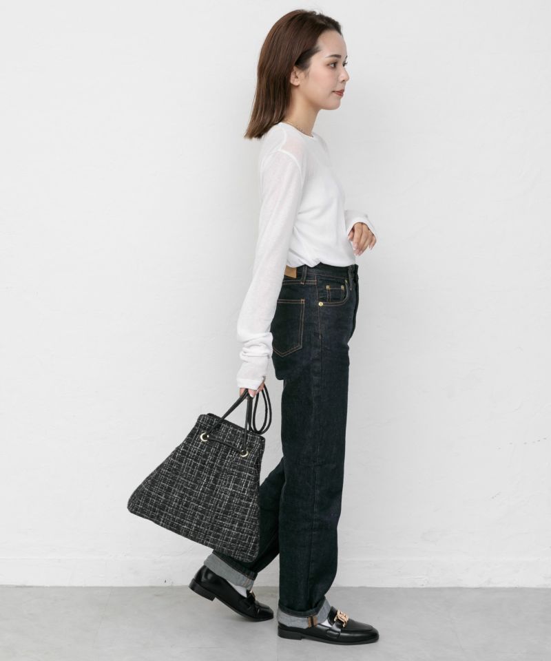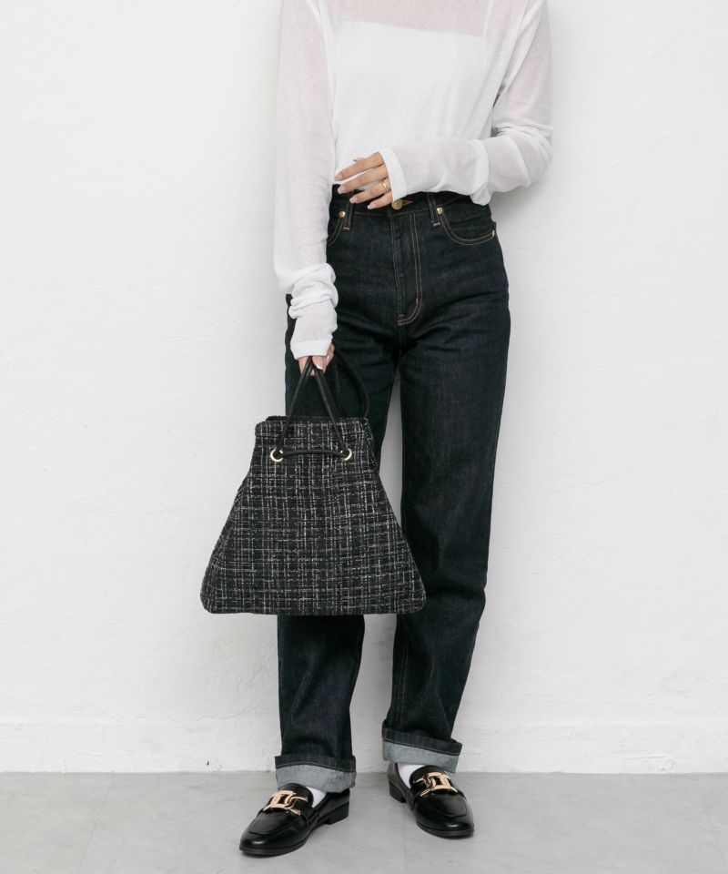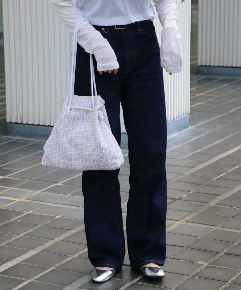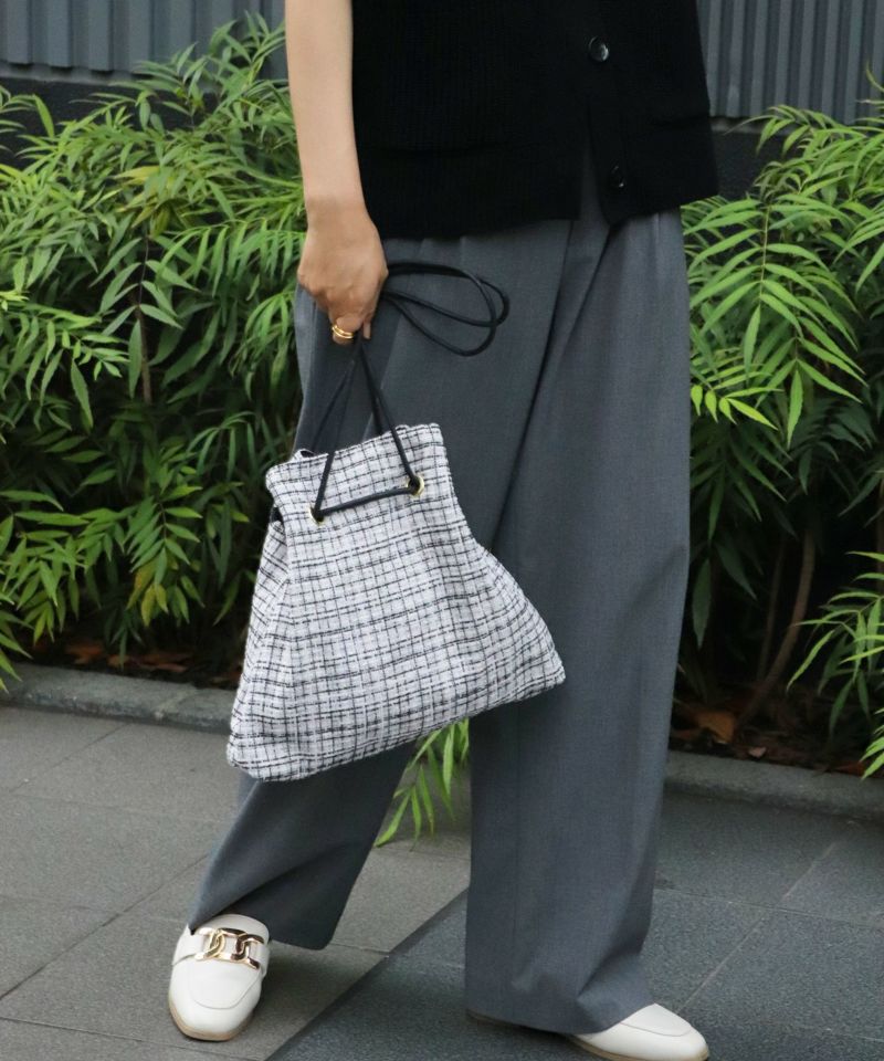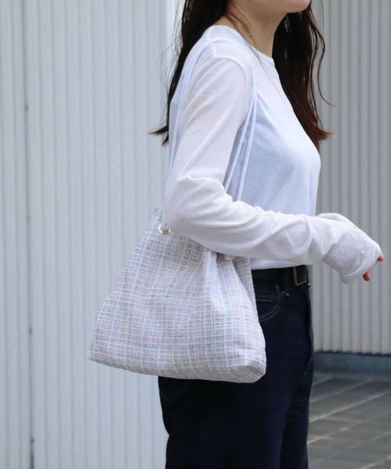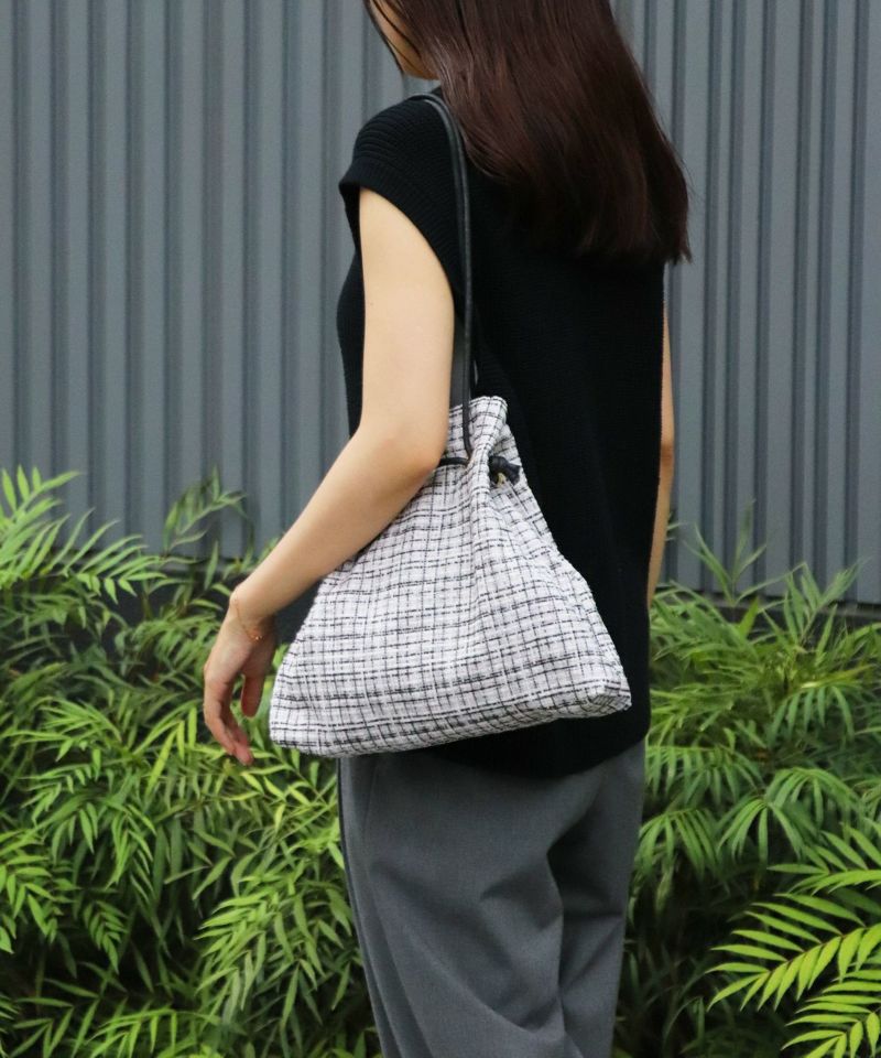 様々なカラーの糸を織り込んで作られたツイード生地で仕立てた巾着ショルダーバッグ。