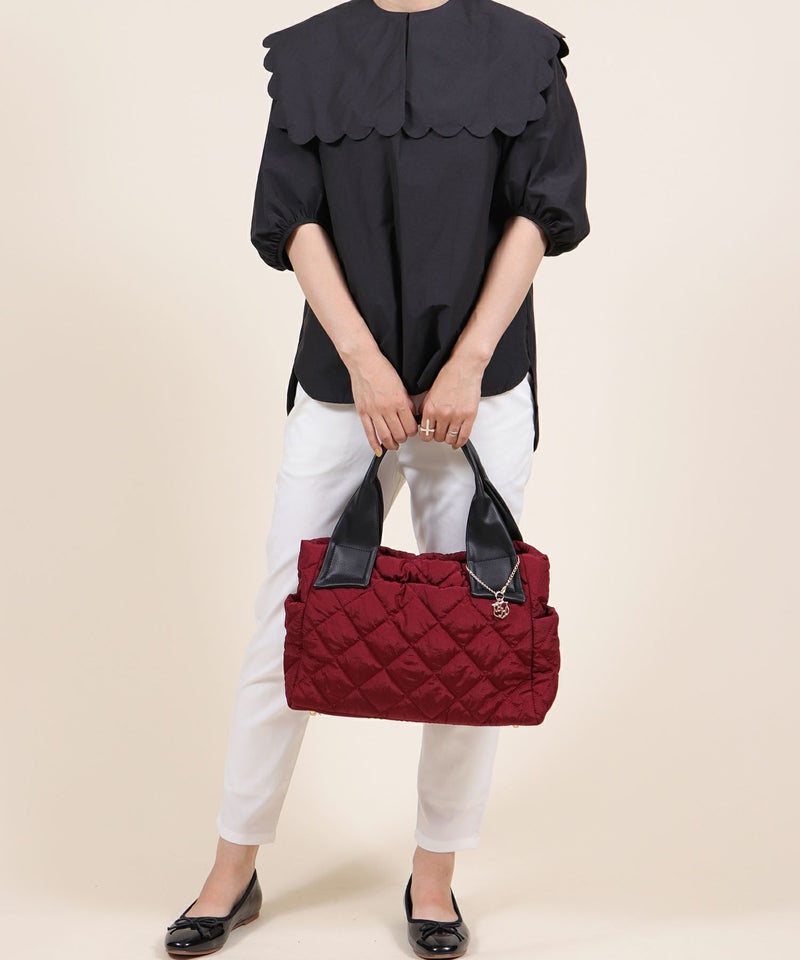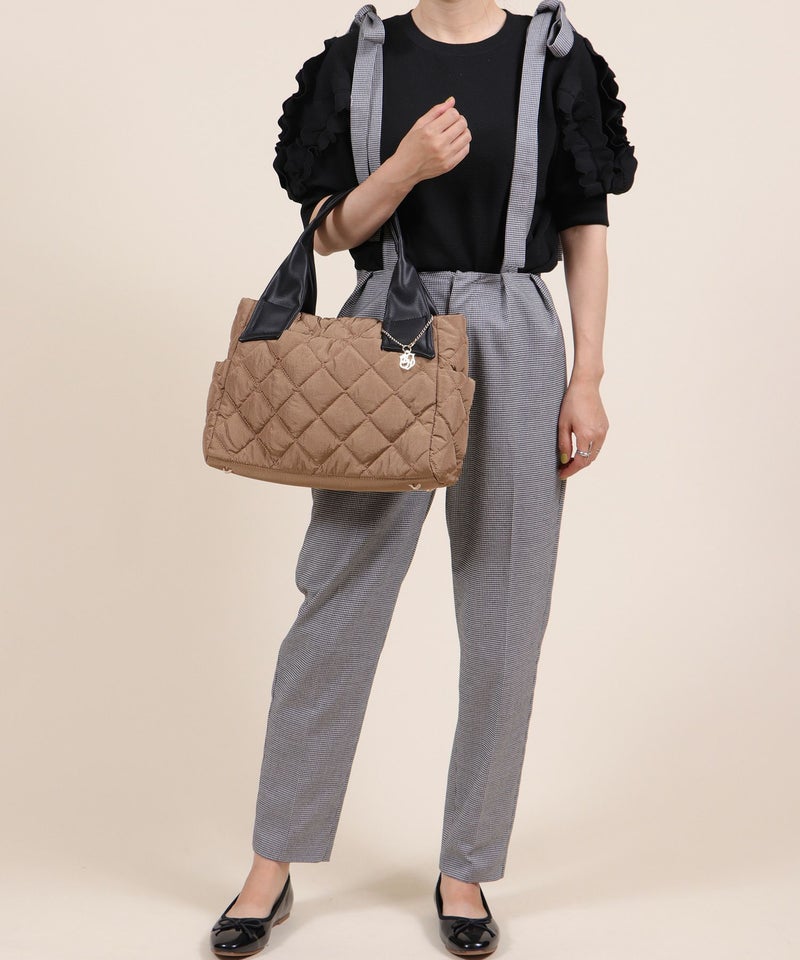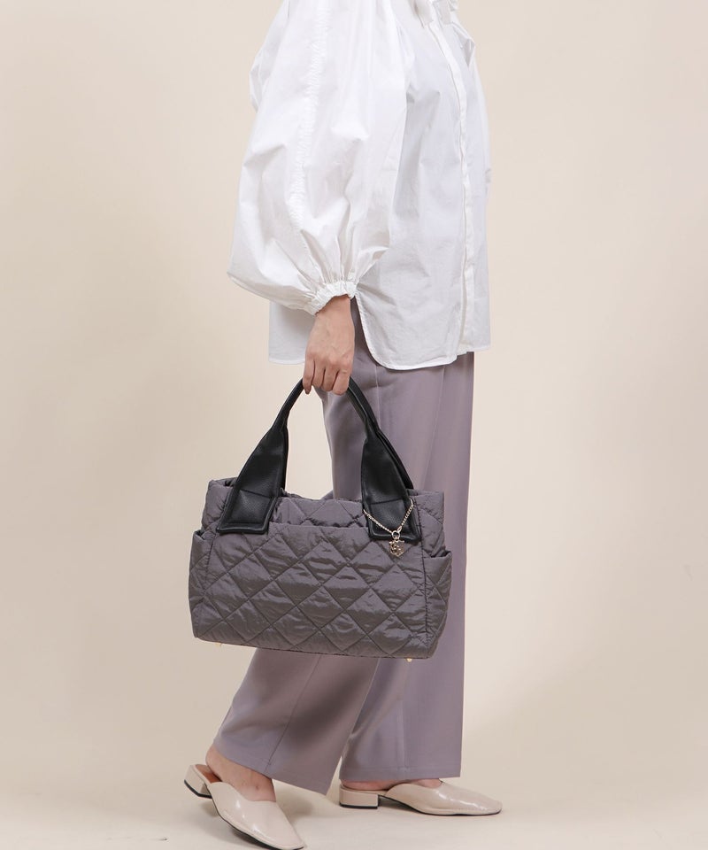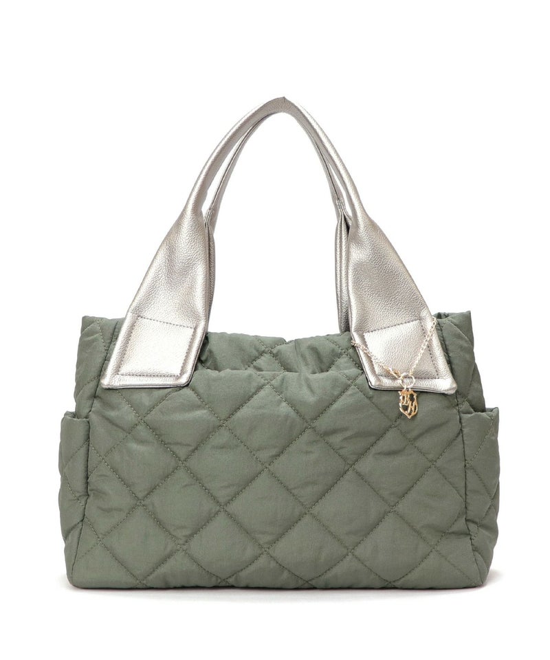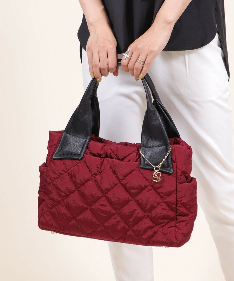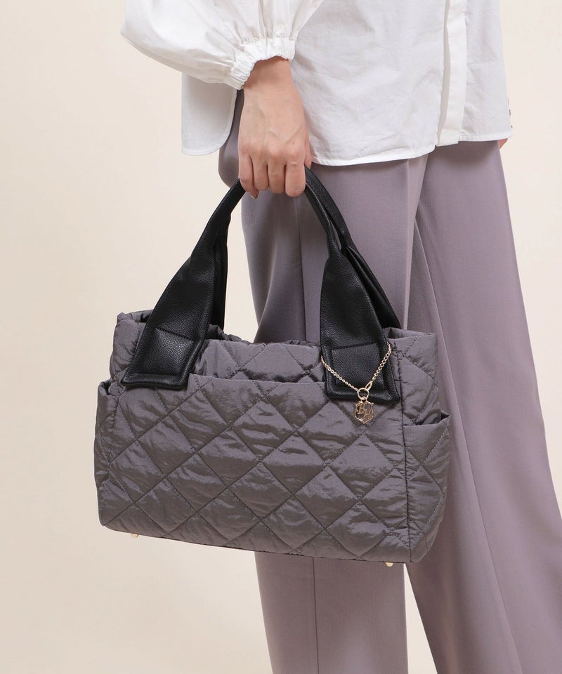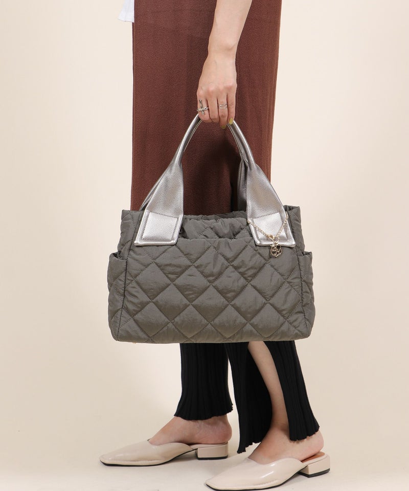 艶感のあるナイロン生地に大きめのキルティングデザインが高級感のある印象。