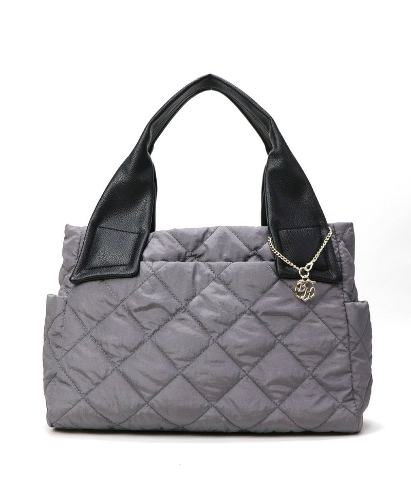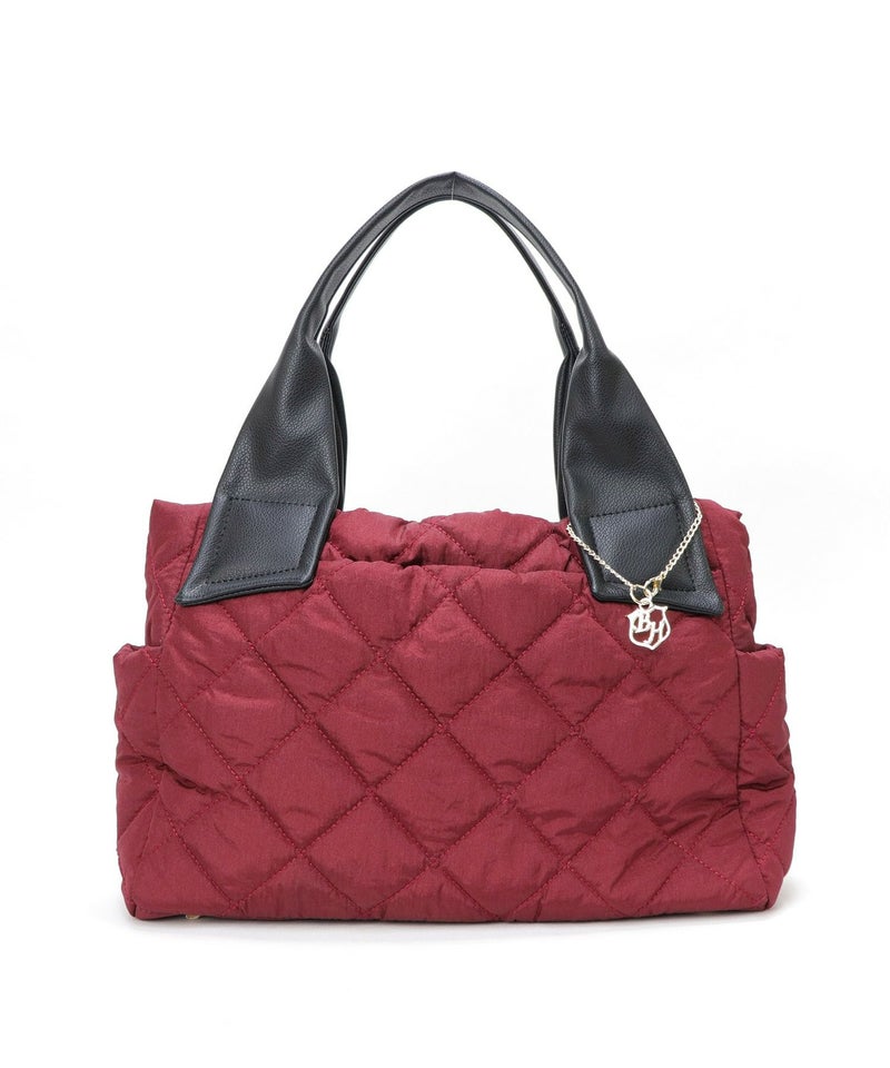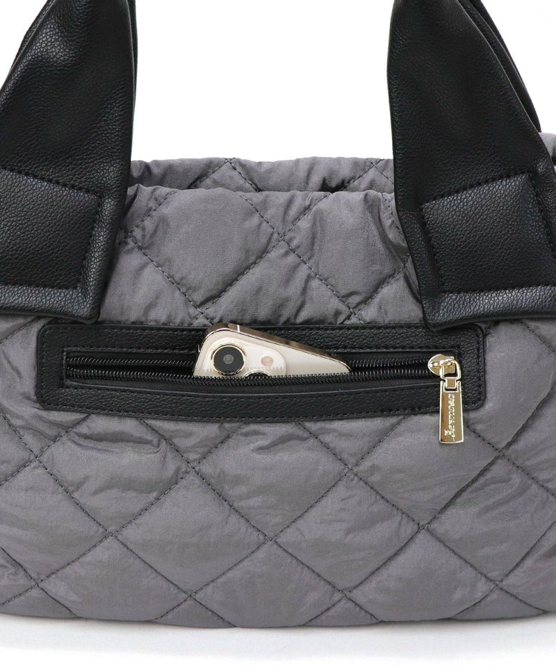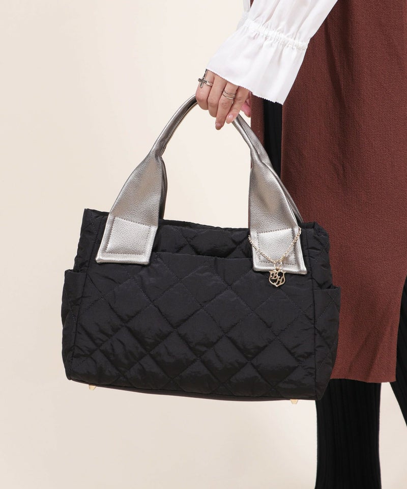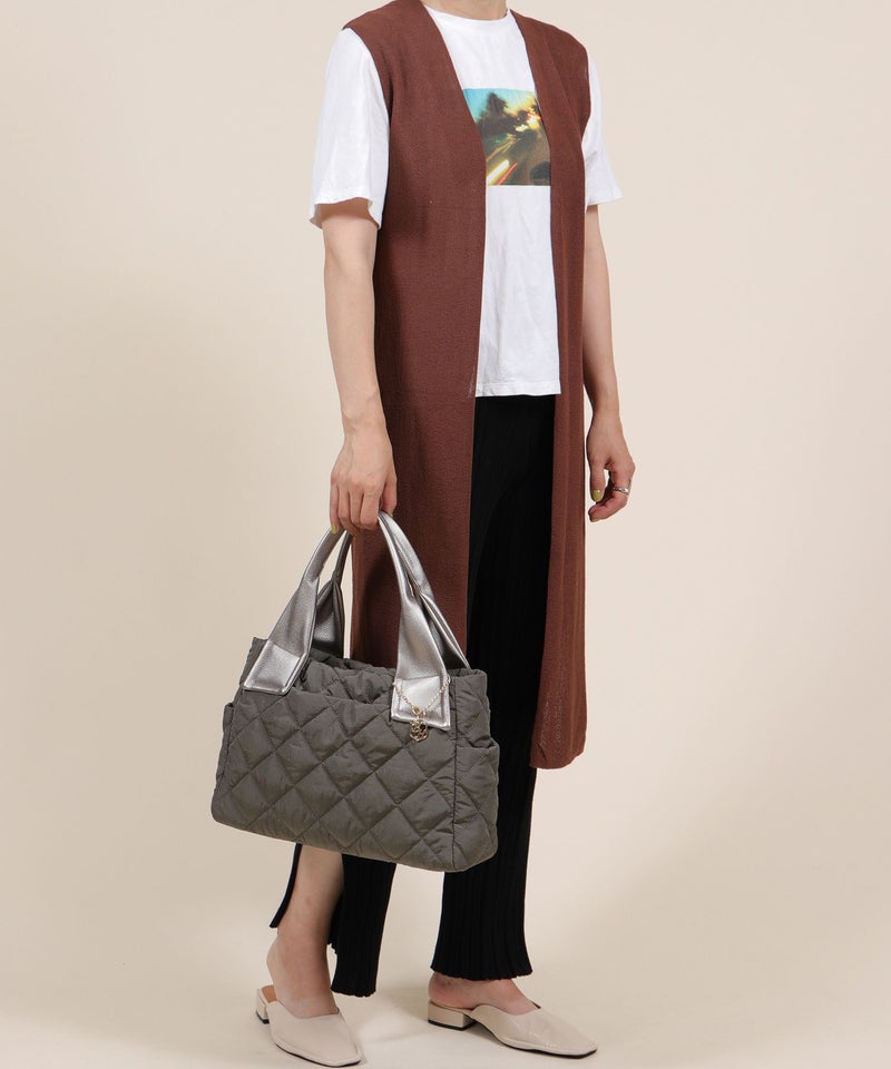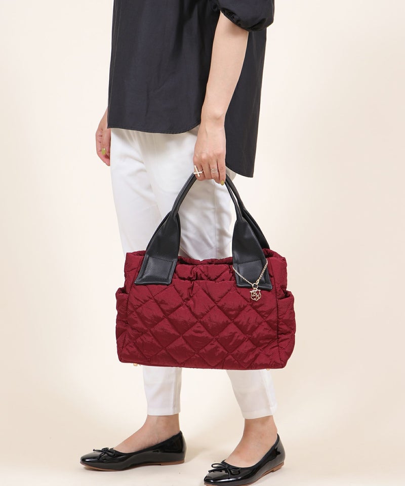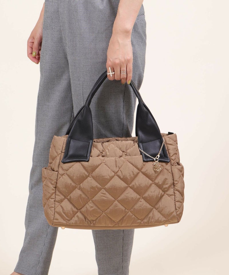 艶感のあるナイロン生地に大きめのキルティングデザインが高級感のある印象。