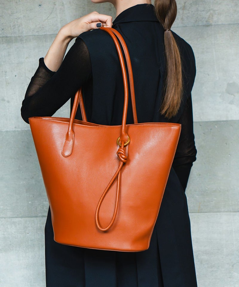 ポイントになるレザーキーリングチャーム付きのバケツ型トートバッグ