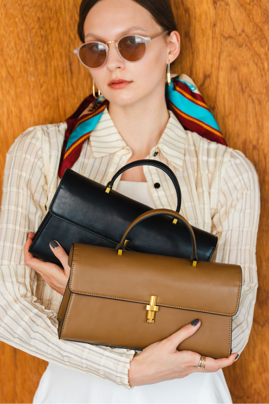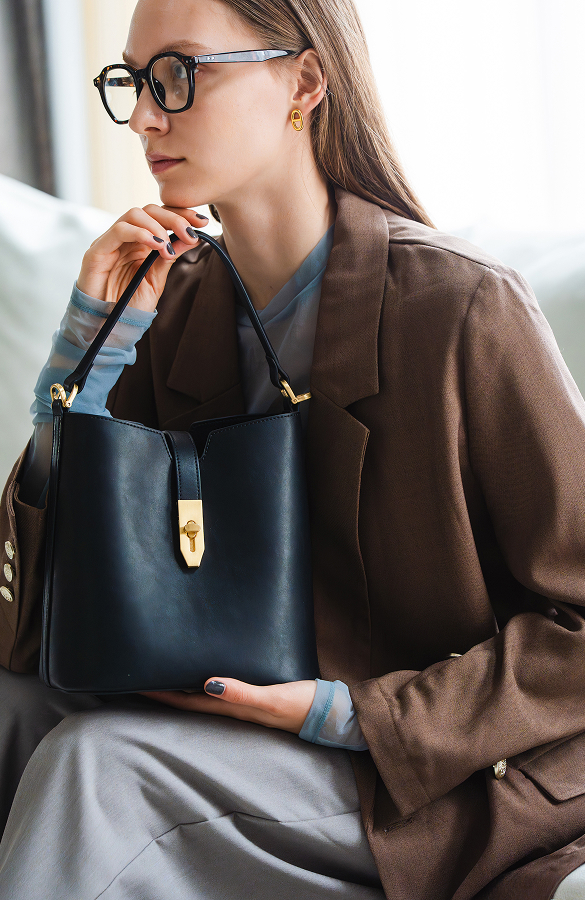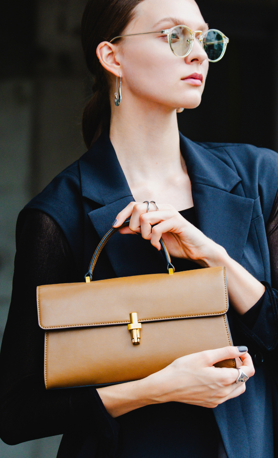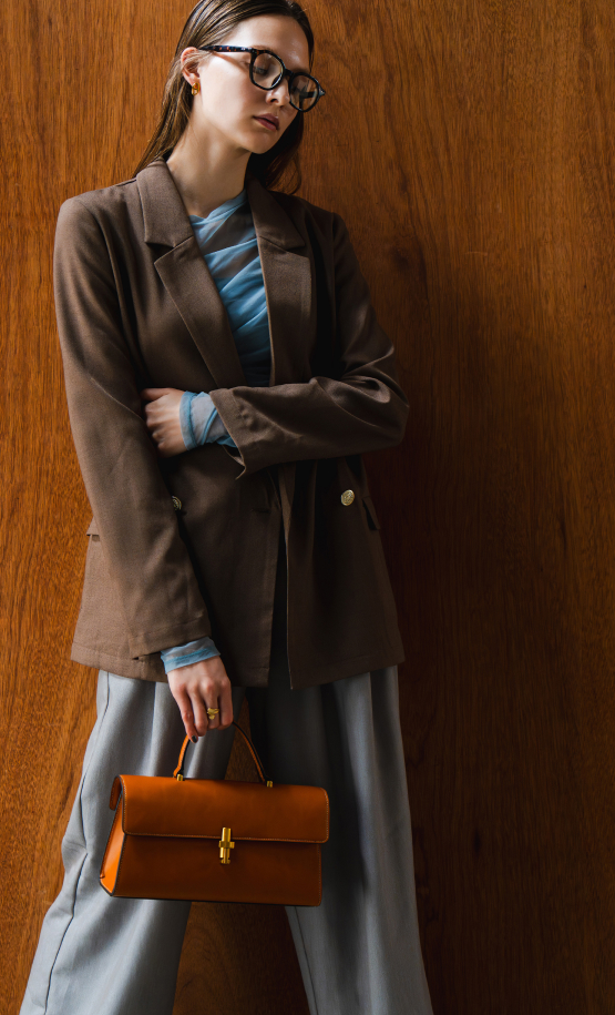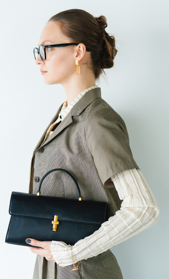 トレンドライクなスクエア型。クラシックな雰囲気もありつつ、どんなにもコーデにも溶け込むデザイン。本革の高級感ある質感とゴールド金具が相性抜群で上品な印象。