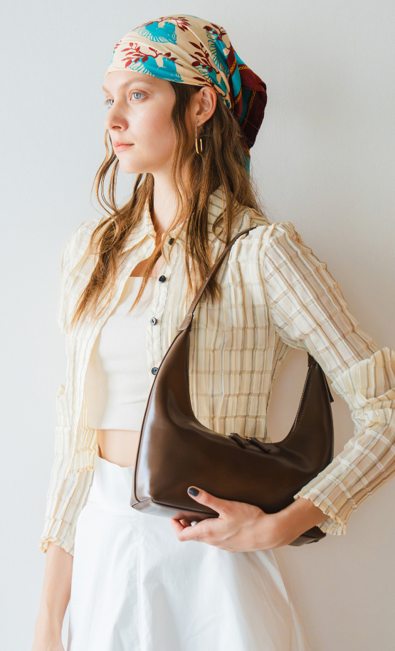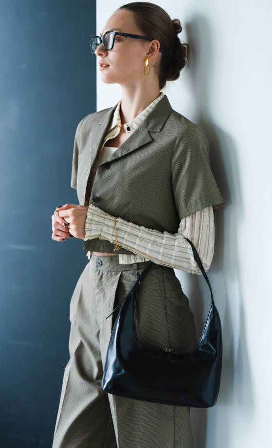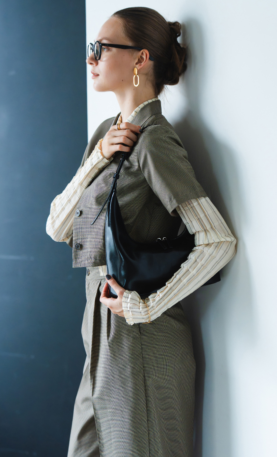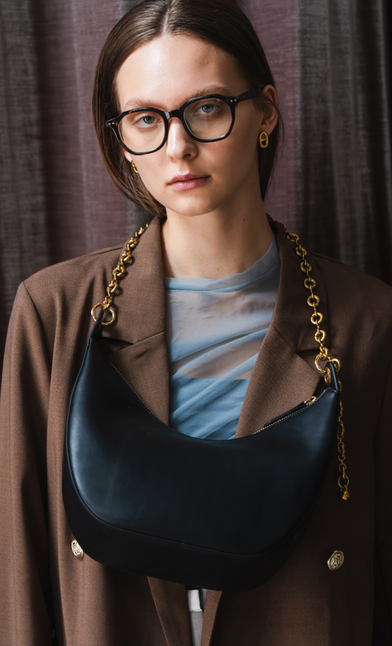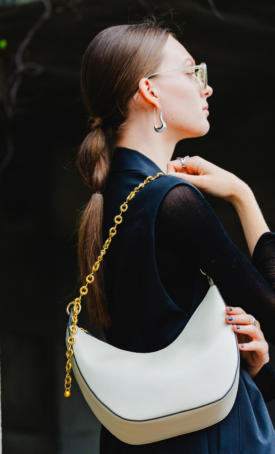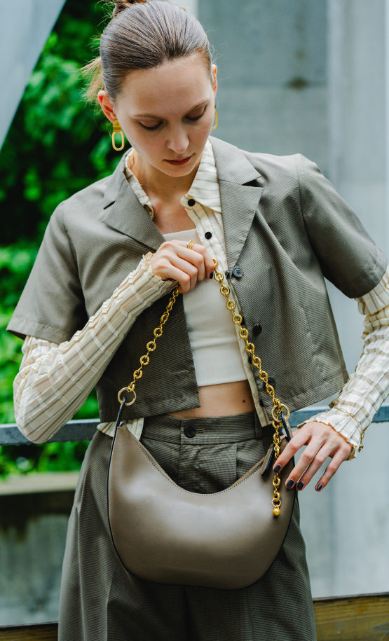 トレンドライクなハーフムーン型。長さ調節が自由にできるチェーンショルダーがポイントの遊び心あるデザイン。